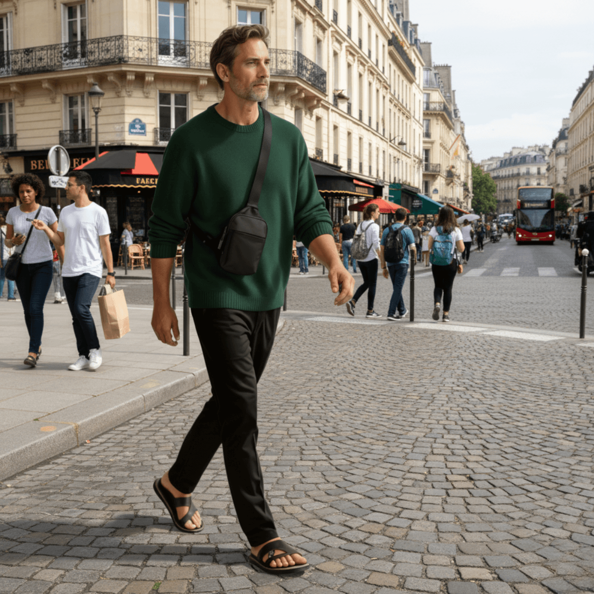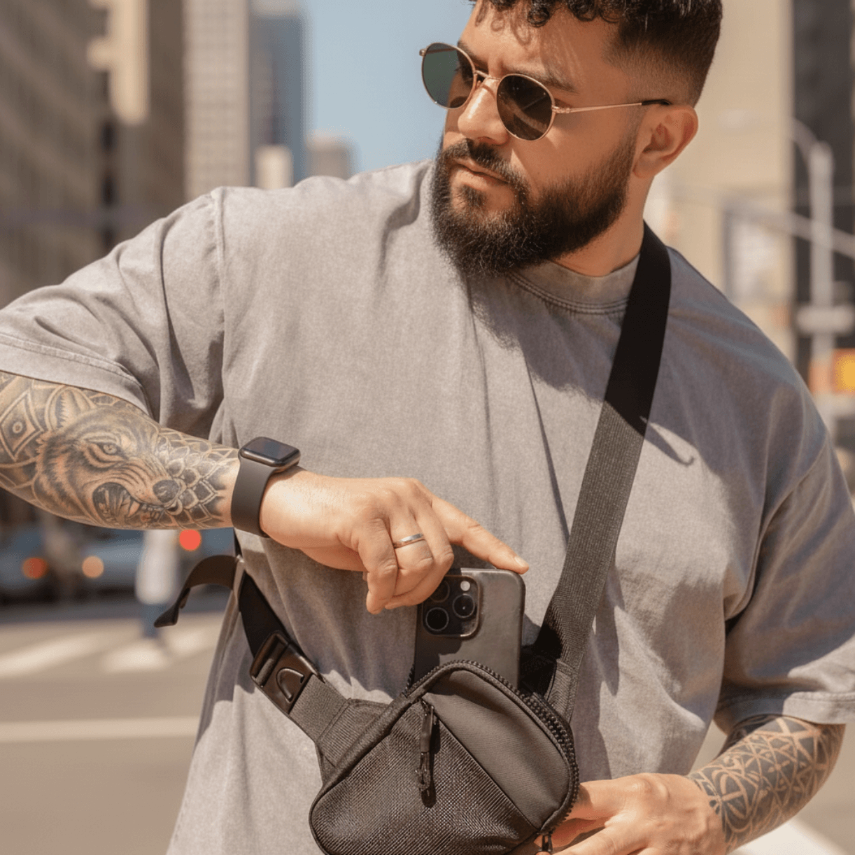 La sacoche NOMALERO™ vous libère les poches et les mains, transporte uniquement l’essentiel et allie praticité et style à chaque déplacement.